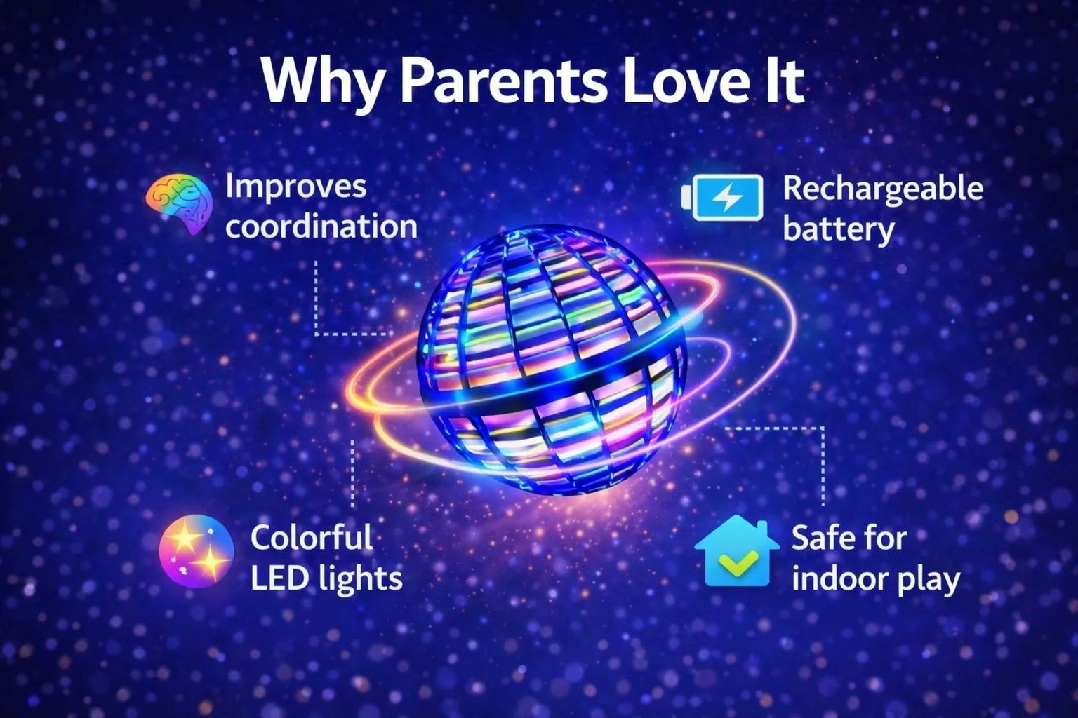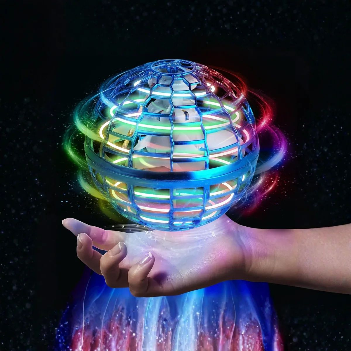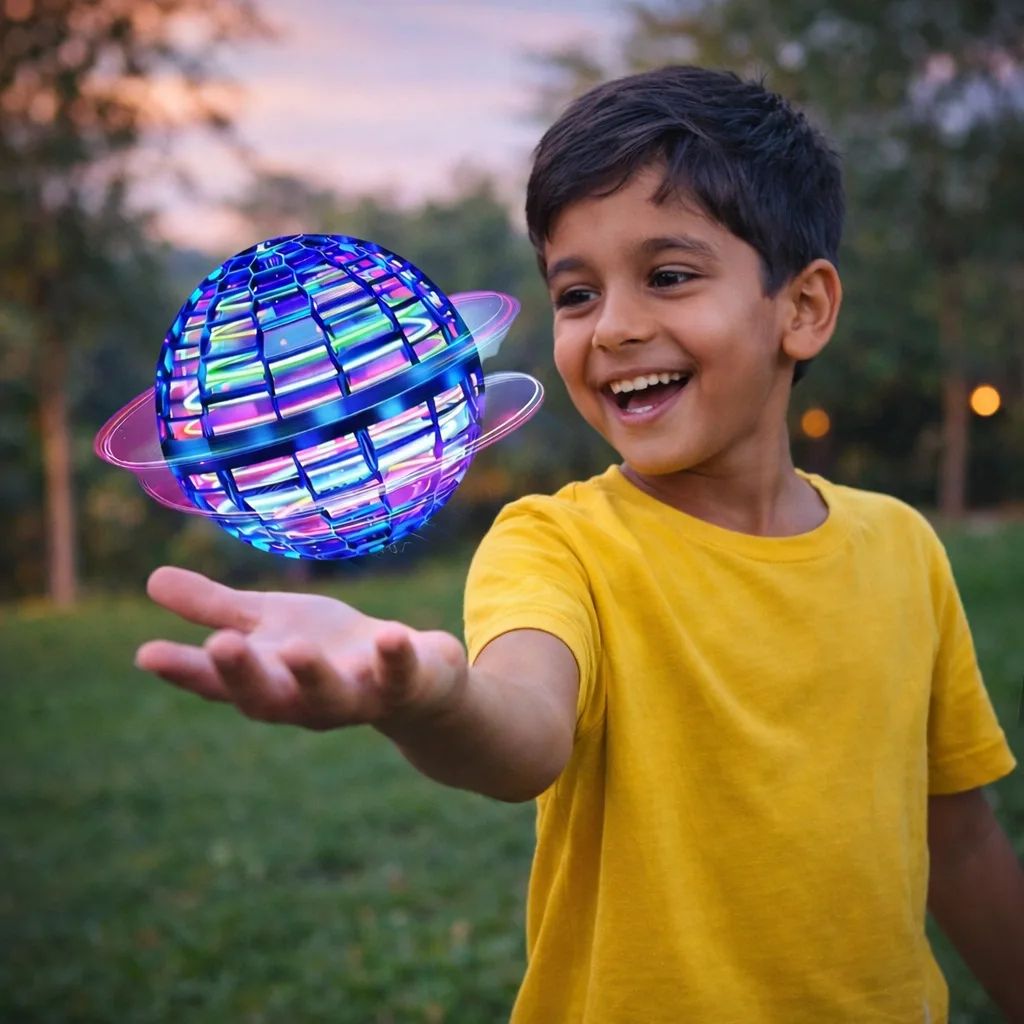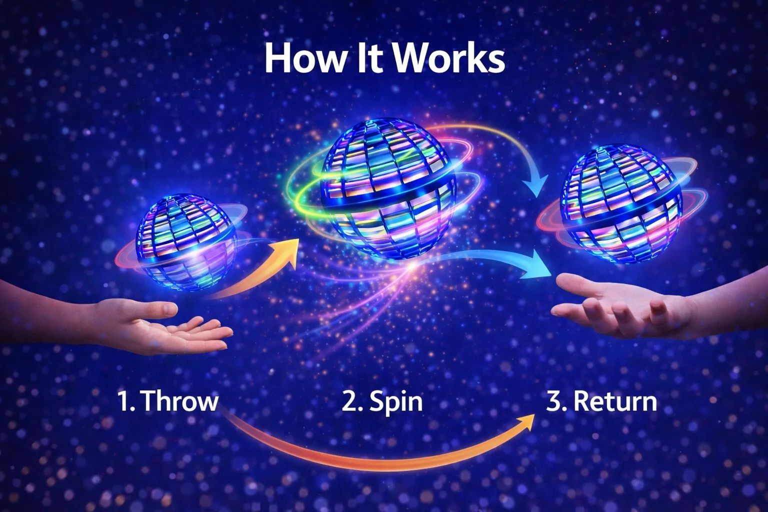 Hand-controlled LED flying spinner ball that glides, spins and returns like a boomerang.